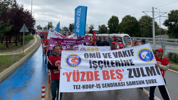 Tez-Koop İş Sendikası Samsun Şubesi’nin, Ondokuz Mayıs Üniversitesi (OMÜ) işçilerinin üniversite yönetiminin sadece yüzde 5 maaş zammı önermesine tepkileri sürüyor. Tez-Koop İş Sendikası’nda örgütlü işçiler, sefalet zammına tepki göstererek üniversite kampüsünde yürüyüş düzenledi.