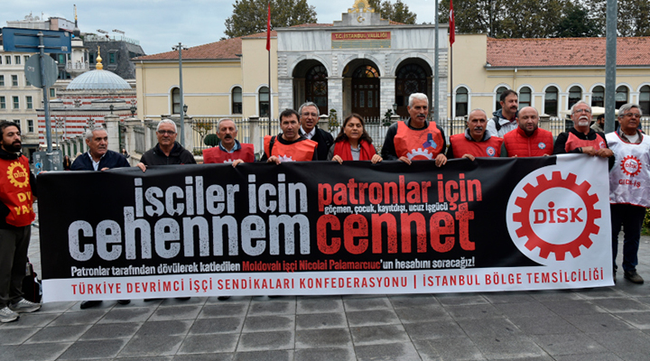 Devrimci İşçi Sendikaları Konfederasyonu (DİSK) İstanbul Temsilciliği, Başakşehir’de Cihan Deri’de çalışan Moldovalı göçmen işçi Nicolai Palamarcıuc’un patronun akrabaları tarafından dövülerek katledilmesini İstanbul Valiliği önünde protesto etti.