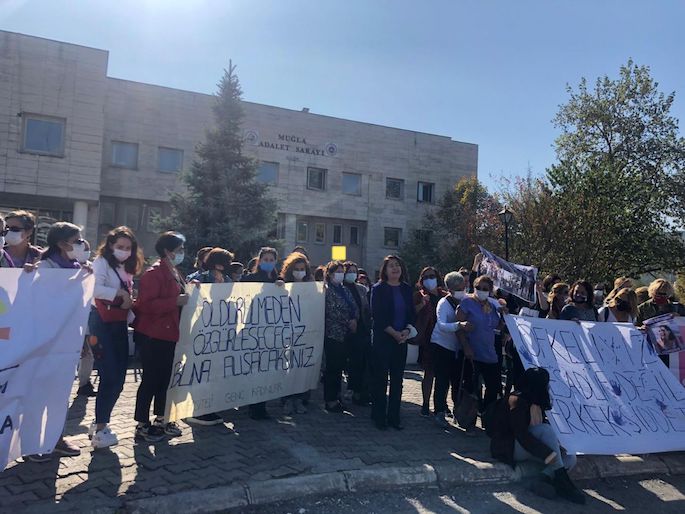 Muğla’da, Pınar Gültekin’i katleden failler Cemal Metin Avcı ve kardeşi Mertcan Avcı’nın duruşması öncesi Adliye önünde bir araya gelen kadınlar yaptığı açıklamada, “hepinizi adliye koridolarında devem eden erkek devletin davranışları olan sözde namus kavramına, haklı tahrik zırvalılarına sözde bahanelerle yapılan indirimlere müsaade etmemek için davaya sahip çıkmaya çağırıyoruz” dedi.