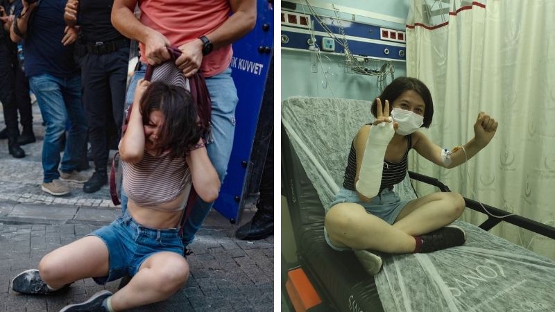 Liseli Öğrenci Birliği (LÖB) üyesi Berfin Polat, polisin saldırısında yerlerde sürüklenerek gözaltına alındı, işkence gördü. Hastanede muayene olan Polat’ın polisin saldırısı sırasında kolunun kırıldığı öğrenildi.