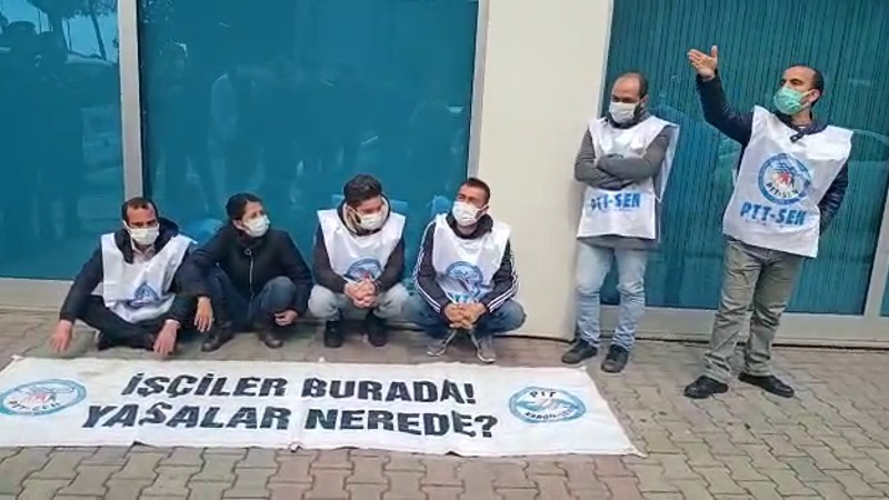 SGK İl Müdürlüğü önünde “Sendika burada yasalar nerede” pankartı açan PTT işçileri oturma eylemlerini sürdürdüğü sırada polisin saldırıyla gözaltına alındı. Gözaltı sırasında işçiler “Sendika hakkımız engellenemez” sloganını attı.