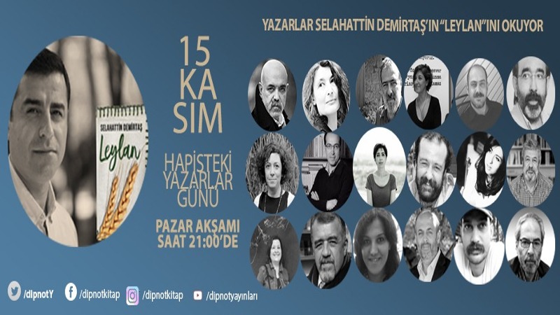 Ercan Kesal, Ayşegül Devecioğlu, Gaye Boralıoğlu, Burhan Sönmez, Mehtap Ceyran, Gökçer Tahincioğlu ve Ümit Kıvanç’ın da aralarında bulunduğu çok sayıda yazar ve sanatçı Hapisteki Yazarlar Günü dolayısıyla HDP eski Eş Genel Başkanı Selahattin Demirtaş’ın yazdığı “Leylan” adlı romanı seslendirecek.
