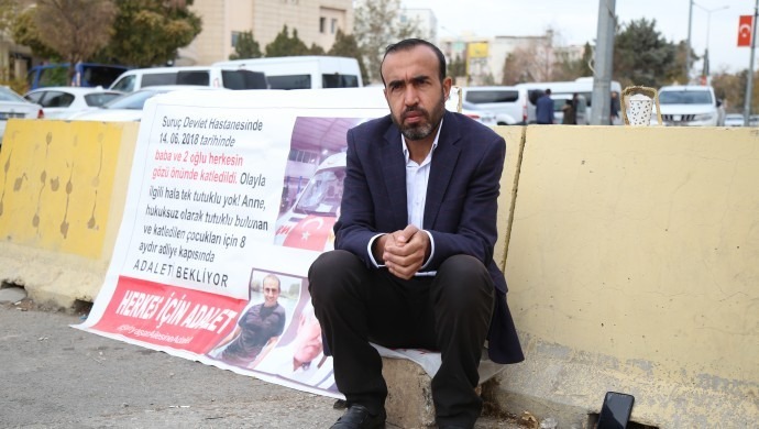 AKP Urfa Milletvekili İbrahim Halil Yıldız’ın koruma ve yakınlarının 14 Haziran 2018’deki saldırısı sonucu eşi ve iki oğlunu yitiren Emine Şenyaşar ile saldırıdan yaralı kurtulan oğlu Ferit Şenyaşar’ın Urfa Adliyesi önünde devam ettirdikleri Adalet Nöbeti 281’inci gününde devam ediyor.