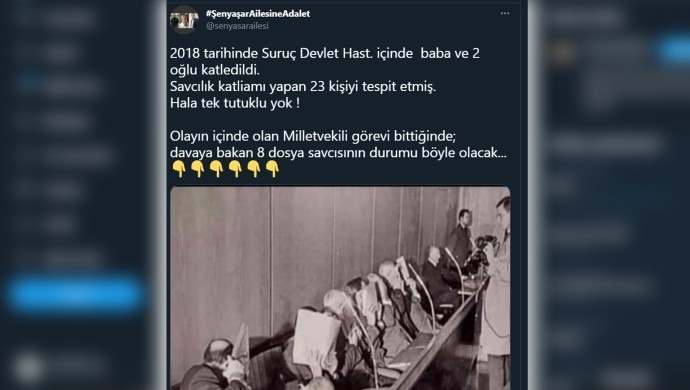 Aile, sanal medya hesabından yaptığı paylaşımda, Nazi savaş suçlarına ilişkin ‘Treblinka Davası’ndaki yargılanan on sanığın yüzlerini kapattıkları fotoğrafı, “2018 tarihinde Suruç Devlet Hastanesi’nin içinde baba ve 2 oğlu katledildi. Savcılık katliamı yapan 23 kişiyi tespit etmiş. Hala tek tutuklu yok! Olayın içinde olan Milletvekili görevi bittiğinde; davaya bakan 8 dosya savcısının durumu böyle olacak…” mesajıyla paylaştı.