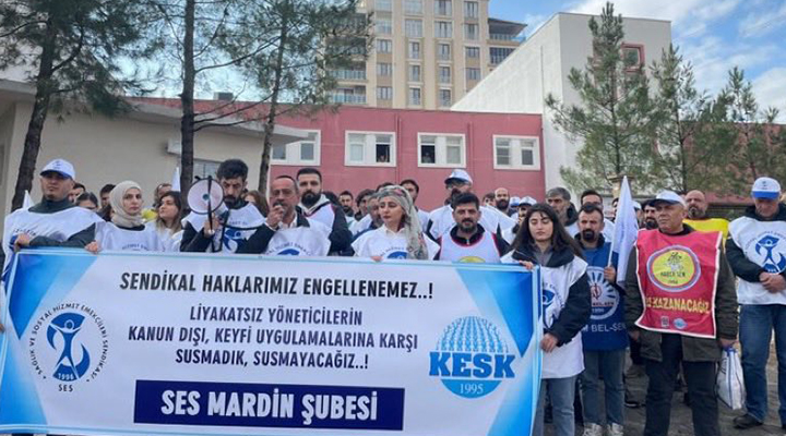 Sağlık ve Sosyal Hizmet Emekçileri Sendikası (SES) Mardin Şubesi, sendikal faaliyet yürüttüğü Aile, Çalışma ve Sosyal Hizmetler İl Müdürlüğü Artuklu Hizmet Merkezi’nde örgütlenme çalışmalarının engellenmek istemesine tepki gösterdi.
