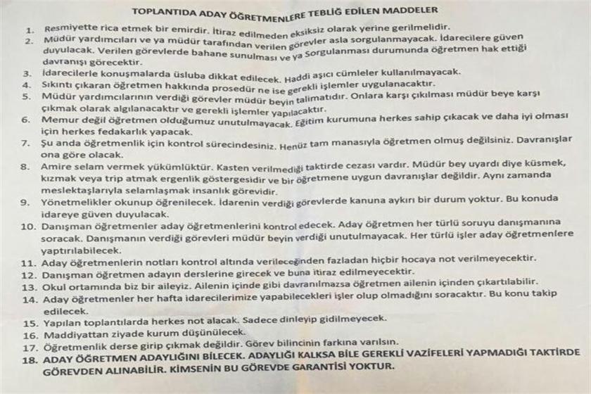 Öğretmenlere gönderilen 18 maddelik talimatname şöyle: