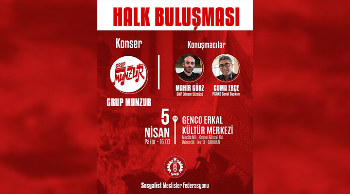 Sosyalist Meclisler Federasyonu (SMF), İstanbul Sarıgazi’de “Halk Buluşması” düzenleyecek. 5 Nisan Pazar günü saat 16.00’da Genco Erkal Kültür Merkezi’nde gerçekleştirilecek buluşmada konser ve söyleşi bir arada yapılacak.
