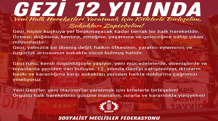 SMF yaptığı açıklamada; “Gezi 12’inci yılında. Yeni halk hareketleri yaratmak için kitlelerle birleşelim, sokakları zapt edelim. Gezi, hiçbir kuşkuya yer bırakmayacak kadar berrak bir halk hareketidir. Öznesi; doğasına, kentine, emeğine, yaşamına ve geleceğine sahip çıkan milyonlardır. Gezi, yalnızca bir direniş değil; halkın öfkesinin, yaratıcı eyleminin ve özgürlük arzusunun sokakta vücut bulmuş halidir. Gezi ruhu, kendi özgünlüğüyle yaşıyor; yeni mücadelelerde, direnişlerde ve isyanlarda yeniden can buluyor. 12. yılında Gezi’yi sahipleniyor, iktidarın baskı ve karanlığına karşı sokakları yeniden halkla doldurma çağrımızı yineliyoruz. Yeni Gezi’ler, yeni Haziran’lar yaratmak için kitlelerle birleşelim.  Örgütlü halk hareketinin gücüne inanalım, ısrarla ve kararlılıkla yürüyelim!” dedi.