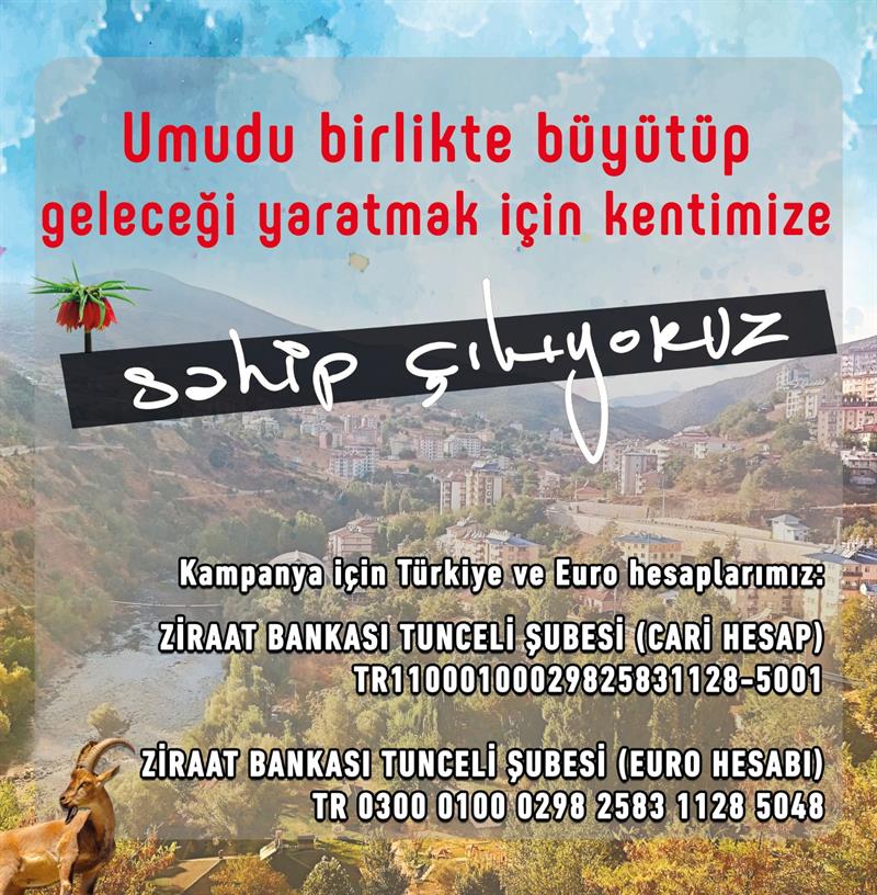 Bu memleket ve kentimiz Dersim için bir şeyler yapmak isteyen, vicdanlı, sorumlu insanların destekleri temelinde ve yaptıkları yaratıcı önerileri gönüllü bir kampanyaya çevirme kararı verdik. Daha doğru bir açıklama ile söylersek; etkili kitlesel bir seferberlik başlatma kararına vardık. Halkımızın sunmak istediği küçük büyük ama değerli desteklerle üretimden sosyal alanlara, ulaşımdan suya, eğitimden sağlığa, konuttan turizme ve alt yapısına kadar birçok projenin adımlarını bu halk seferberliği ile başlatmış olacağız. Esas çözüm gücü olan Dersim halkı ve dostlarını içeride dışarıda başlattığımız seferberlik fırtınasına katılarak insanlığa örnek olacak bir kent yaratmaya davet ediyoruz. Bunu mutlaka başaracağız zira halkımıza güveniyoruz.