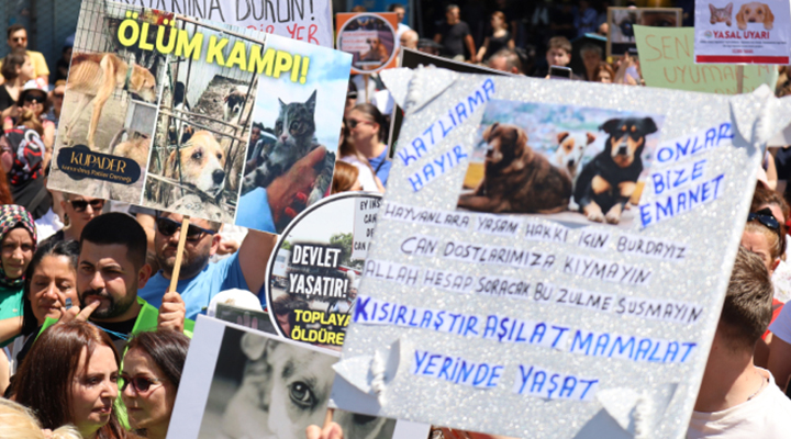 “Hayvan, yaşam, özgürlük” ve “Direne direne kazanacağız” sloganlarının atıldığı mitingde, üzerinde sokak hayvanlarının fotoğraflarının bulunduğu dövizler taşındı.