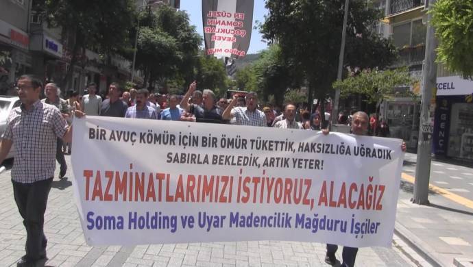 Soma Belediyesi önünde bir araya gelen Soma Holding ve bağlı Işıklar İşletmesi’nden işçiler, “Tazminatlarımızı İstiyoruz, alacağız” yazan pankartla ilçede bulunan Türkiye Kömür İşletmeleri Müdürlüğü (TKİ) önüne doğru yürüyüşe geçti. İşçiler sık sık, “Sorumlu TKİ tazminatımızı ver”, “Kahrolsun sarı sendikacılık” sloganları attı. Polisin yoğun güvenlik önlemleri altında yürüyüşünü sürdüren işçiler, TKİ binası önünde özel güvenlik çemberiyle durduruldu. Bağımsız Maden Sendikası’nın örgütlenme uzmanı Kamil Kartal ve yanındaki üç işçi yetkililere işçilerin tazminat haklarını almak için yazdıkları dilekçeleri verdi.