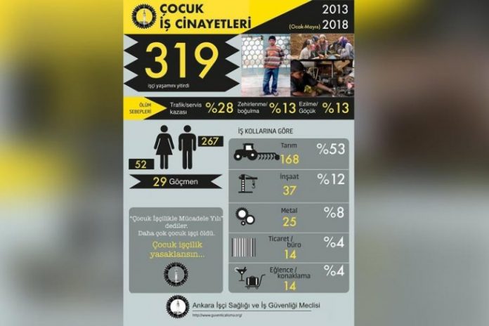 Evrensel’in haberine göre Ankara İşçi Sağlığı ve İş Güvenliği Meclisi, “Türkiye’de Çocuk İşçiliği ve Çocuk İş Cinayetleri Raporu”nu açıkladı. Rapora göre 2013’ten 2018’in ilk 5 ayına kadar 319 çocuk iş cinayetleri nedeniyle yaşamını yitirdi, 2014-2016 yılları arasında 13 bin 616 sigortalı çocuk işçi iş kazası geçirdi. Çocuk işçi ölümlerinin en çok yaşandığı iller, mülteci nüfusunun yoğun olduğu Adana, Urfa ve Antep olurken ölümlerin en çok yaşandığı iş kolu tarım-ormancılık iş kolu oldu.
