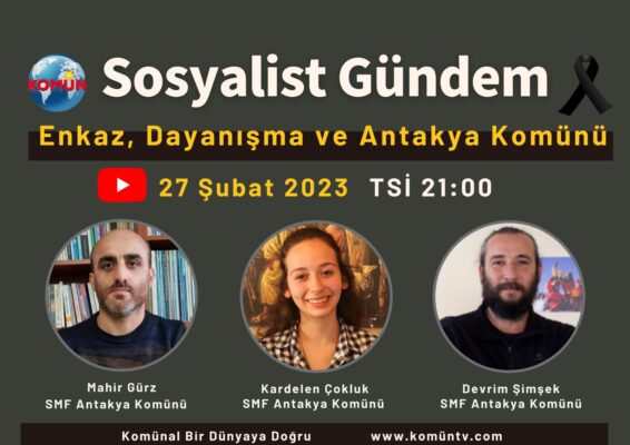Yusuf Dağcı’nın hazırlayıp sunduğu Sosyalist Gündem programına bu akşam Maraş merkezli depremlerin ardından deprem bölgelerinde dayanışma çalışmalarını sürdüren Antakya Komünü’nden Sosyalist Meclisler Federasyonu (SMF) üyeleri katılacak. “Enkaz, Dayanışma ve Antakya Komünü” konularının ele alınacağı programa SMF MYK üyeleri Mahir Gürz, Devrim Şimşek ve Kardelen Çokluk konuk olacak.