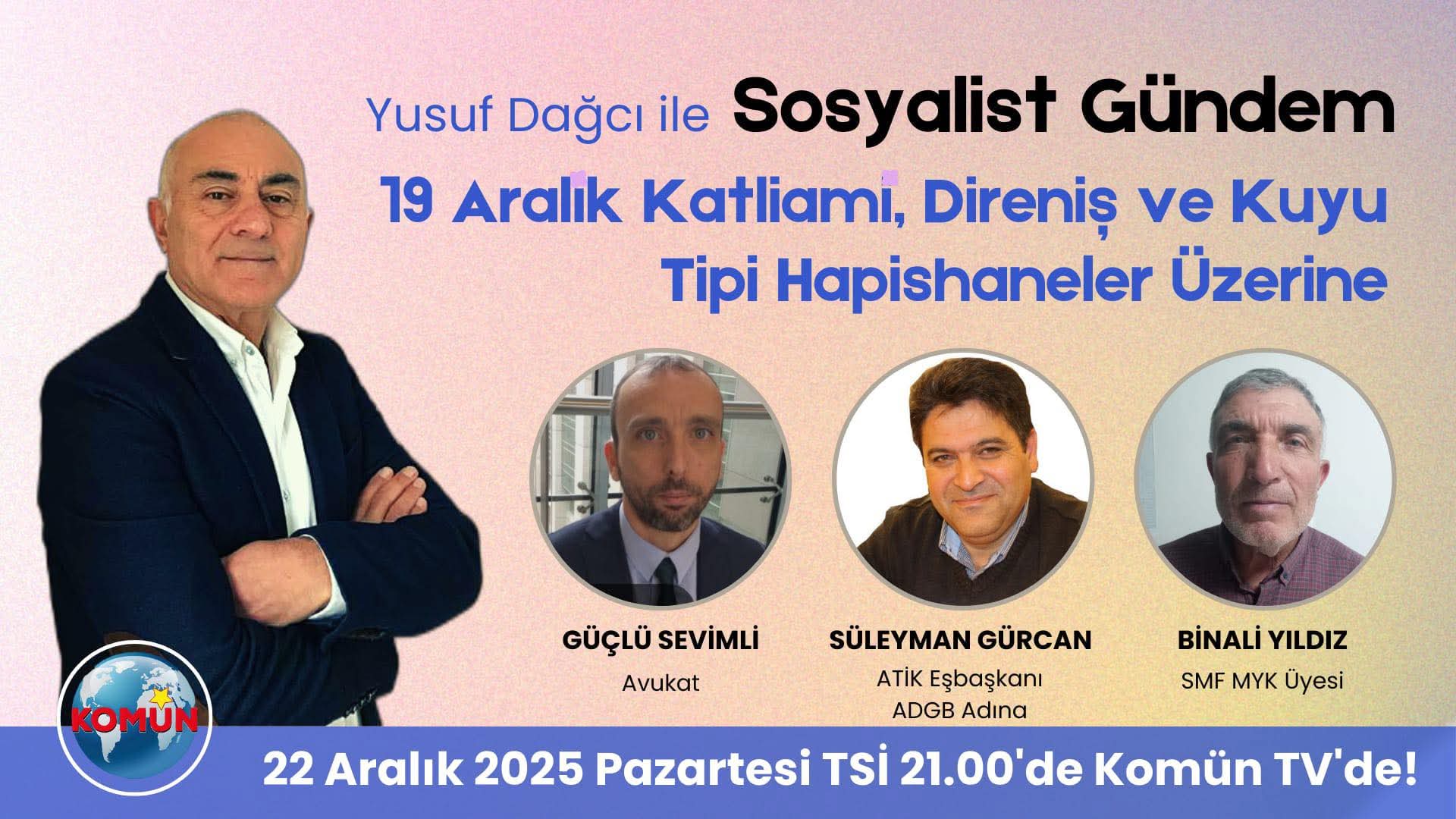 Yusuf Dağcı’nın hazırlayıp sunduğu Sosyalist Gündem programı bu hafta, “19 Aralık Katliamı, Direniş ve Kuyu Tipi Hapishaneler Üzerine” konusu ile izleyici karşısına çıkıyor.