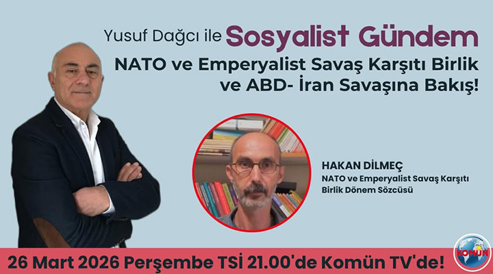 NATO ve Emperyalist Savaş Karşıtı Birlik Dönem Sözcüsü Hakan Dilmeç’in konuk olacağı Sosyalist Gündem programını yarın akşam Türkiye saatiyle 21.00’de Komün TV’nin YouTubeFacebook ve X (Twitter) sayfalarından canlı olarak izleyebilirsiniz.