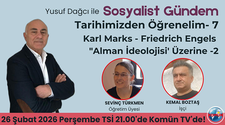 Komün TV’de Yusuf Dağcı’nın hazırlayıp sunduğu “Sosyalist Gündem” programının “Tarihimizden Öğrenelim” temalı 7. bölümü, bu hafta “Karl Marx–Friedrich Engels ‘Alman İdeolojisi’ Üzerine-2” konu başlığıyla izleyiciyle buluşuyor.