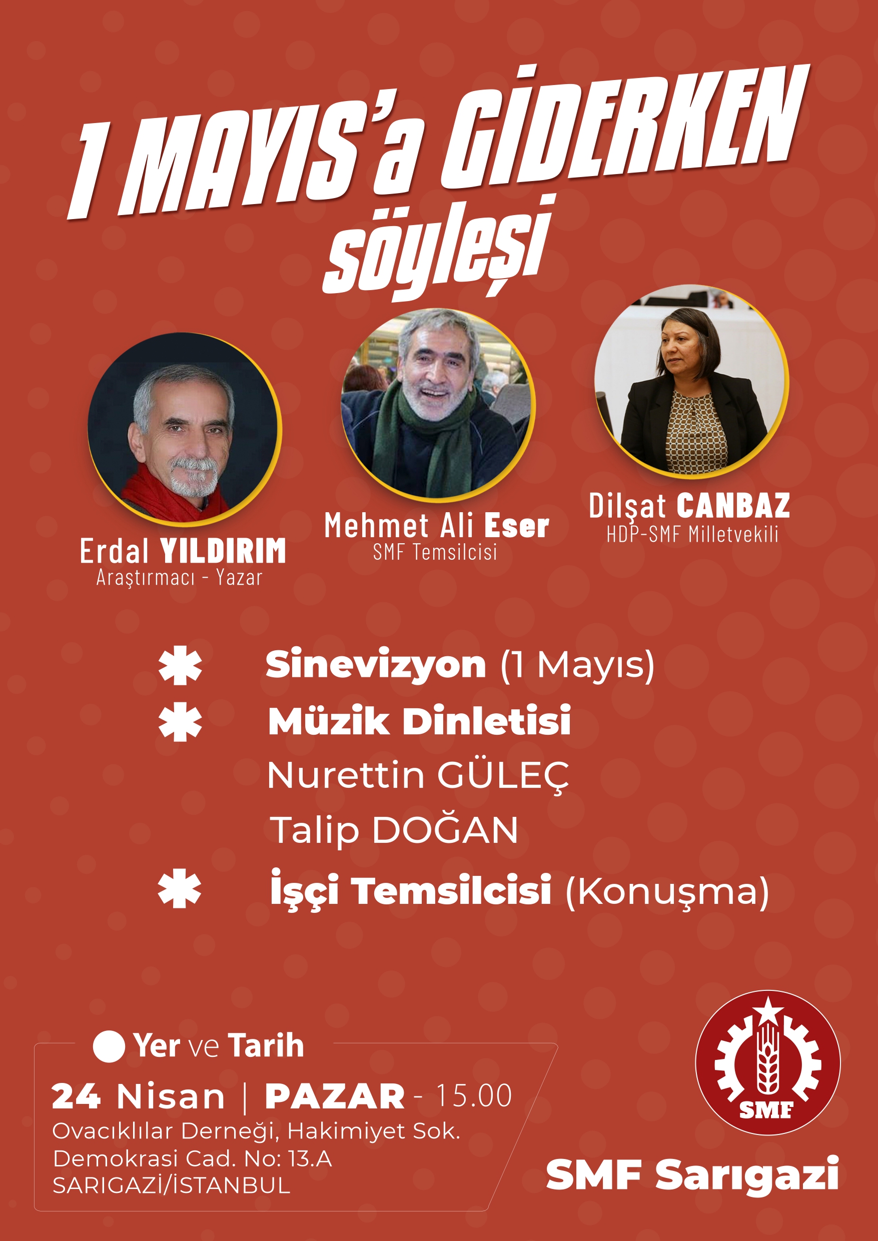 1 Mayıs konulu sinevizyon gösterimi ile başlayacak söyleşide, işçi temsilcisi, yazar Erdal Yıldırım, Sosyalist Meclisler Federasyonu temsilcisi Mehmet Ali Eser ve SMF/HDP İstanbul Milletvekili Dilşat Canbaz konuşmacı olarak yer alacak.