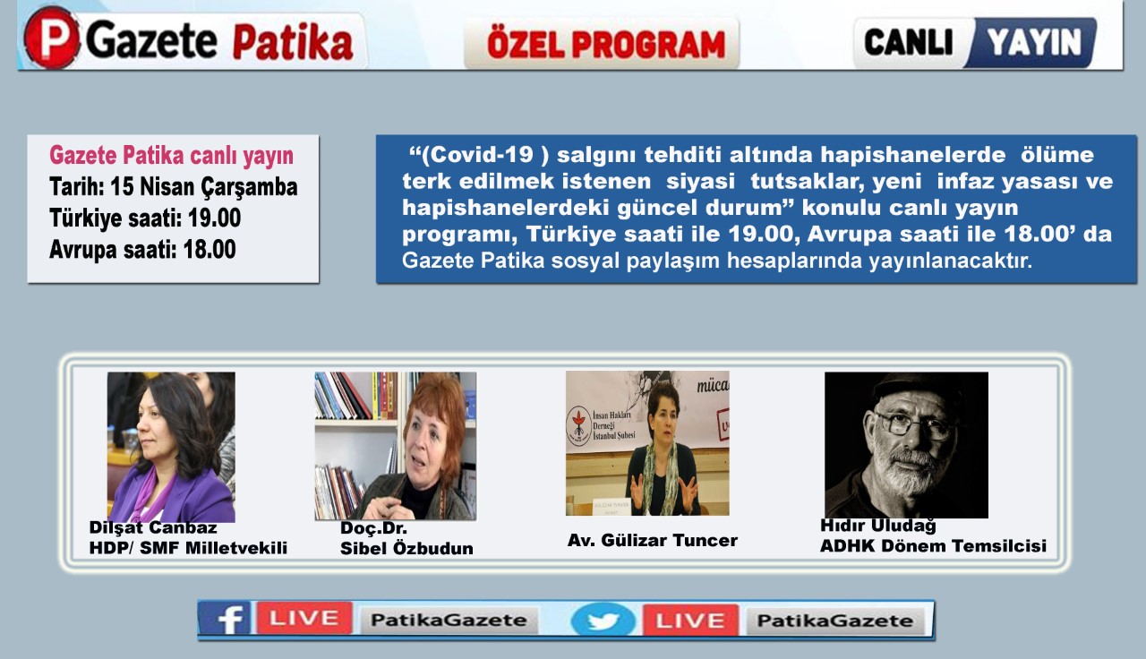 Gazete Patika olarak, virüs salgınının olduğu bu günlerde gündeme ilişkin konuları konuştuğumuz canlı yayınlarımıza devam ediyoruz. “Covid-19 salgını tehdidi altında hapishanelerde ölüme terk edilmek istenen siyasi tutsaklar, yeni infaz yasası ve hapishanelerdeki güncel durum” konulu söyleşimizi ile koronavirüs tehdidi altındaki hapishaneleri ve yeni infaz yasasını konuşacağız. Söyleşimizi sosyal medya hesaplarımızdan canlı izleyebilirsiniz.