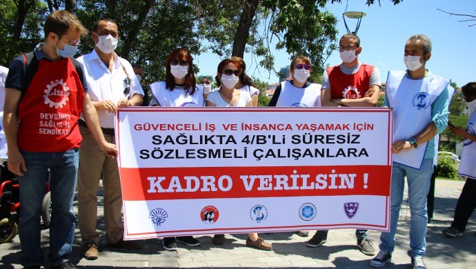 Ankara Tabip Odası (ATO), Devrimci Sağlık İşçileri Sendikası (Dev Sağlık-İş), Sağlık ve Sosyal Hizmet Emekçileri Sendikası (SES), Türk Hemşireler Derneği (THD) ile Tüm Radyoloji Teknisyenleri ve Teknikerleri (Tümrad-Der) sağlık alanında 4/B’li süresiz sözleşmeli çalışma sistemine dair ortak basın açıklaması yaptı.