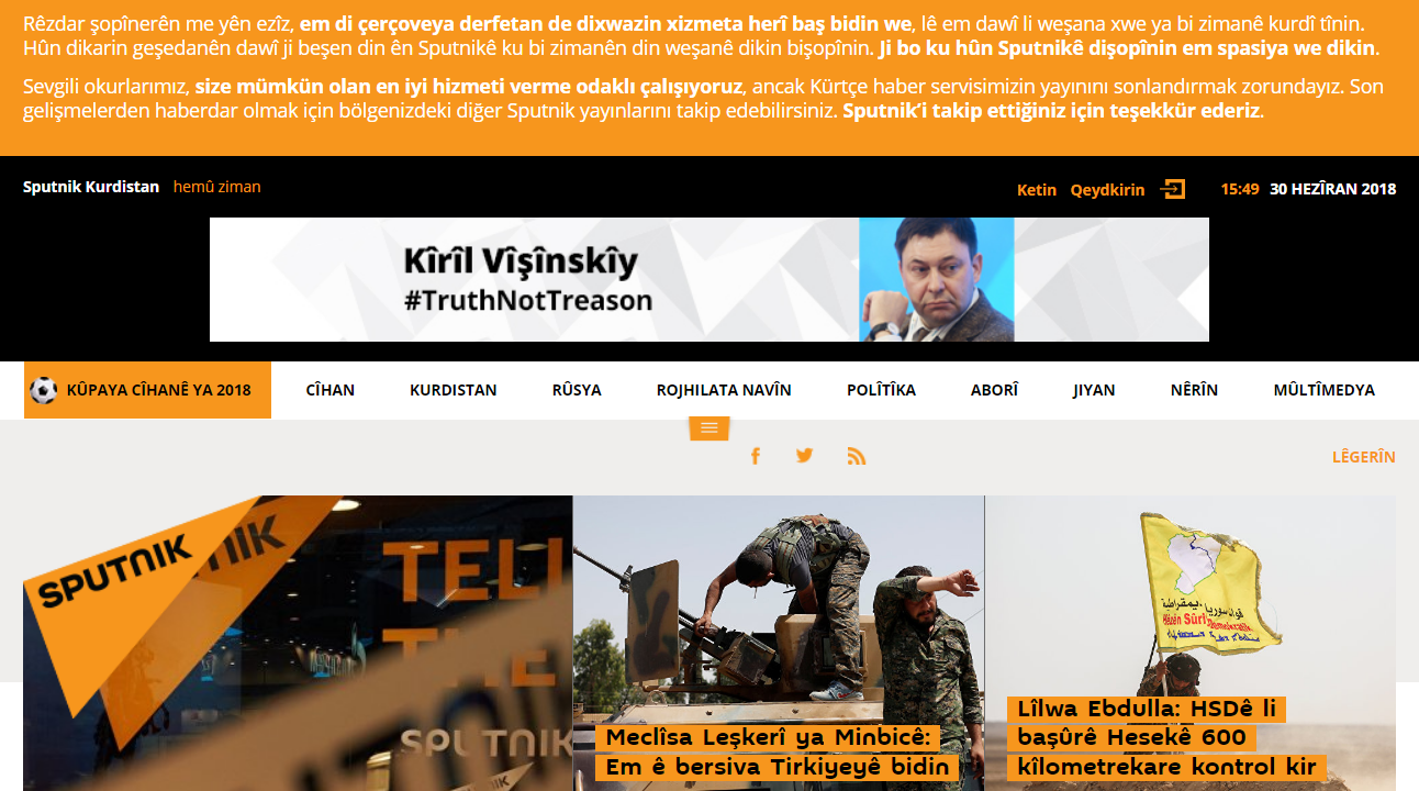 Sputnik haber ajansının internet sitesinde Kürtçe yayınların yapıldığı alanda bulunan açıklamada, “Sevgili okurlarımız, size mümkün olan en iyi hizmeti verme odaklı çalışıyoruz, ancak Kürtçe haber servisimizin yayınını sonlandırmak zorundayız. Son gelişmelerden haberdar olmak için bölgenizdeki diğer Sputnik yayınlarını takip edebilirsiniz. Sputnik’i takip ettiğiniz için teşekkür ederiz” ifadeleri yer aldı.