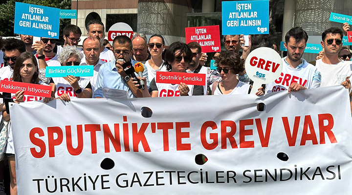 Türkiye Gazeteciler Sendikası (TGS) ve Rossiya Segodnya Uluslararası Haber Ajansı (Sputnik) Türkiye Bürosu arasında toplu iş sözleşmesi görüşmelerinde anlaşmaya varılmaması üzerine TGS öncülüğünde bugün greve başlayan Sputnik işçileri, Şişli’de bulunan Süzer Plaza önünde basın açıklaması yaptı.