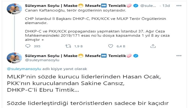 Cumhurbaşkanı Recep Tayyip Erdoğan’ın “Kendisi DHKP-C militanıdır” diyerek hedef almasının ardından bu kez de İçişleri Bakanı Süleyman Soylu, Kaftancıoğlu’na ağır hakaretlerde bulundu.