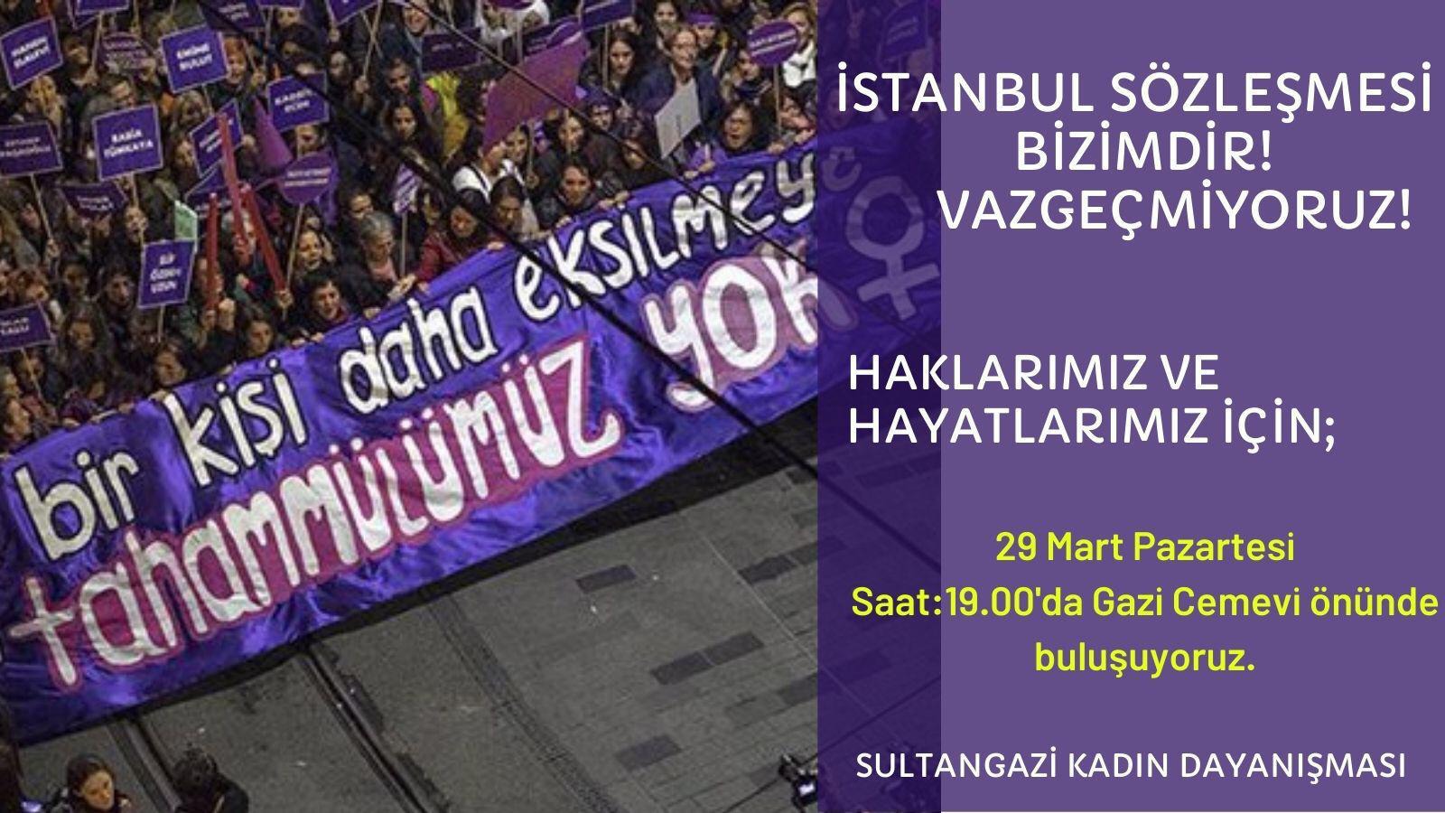 Yapılan çağrıda, “Sultangazi Kadın Dayanışma olarak; 29 Mart Pazartesi günü saat 19.00 da Gazi Cemevi önünde “İstanbul Sözleşmesi Bizimdir Vazgeçmiyoruz” demek için basın açıklaması gerçekleştireceğiz. Katılımınızı bekliyoruz.” ifadelerine yer verildi.