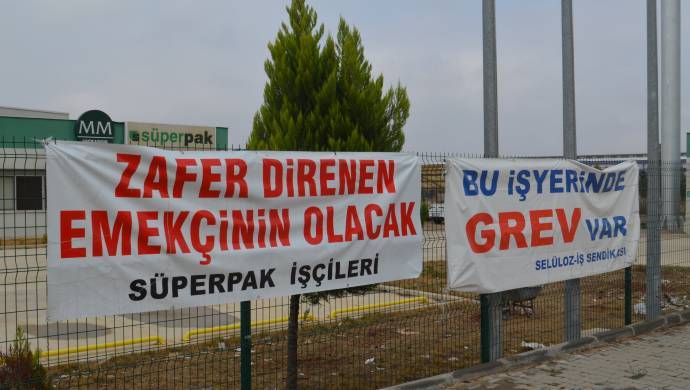 MA’nın haberine göre, Avusturya merkezli Mayr-MelnhofPackaging Şirketi’ne (MM) ait Süperpak Ambalaj’ın İzmir, Karaman ve Antep’te bulunan fabrikalarında çalışan yaklaşık 250 işçinin Toplu İş Sözleşmesi (TİS) görüşmelerinin anlaşmazlıkla sonuçlanması üzerine başlattığı grev, 128’inci güne ulaştı. Türk-İş’e bağlı Selülöz-İş Sendikası üyesi işçiler, maaşlarında net 480 TL zam taleplerine karşı, işverenin siparişlerdeki düşüklüğü gerekçe göstererek yüzde sıfır zam dayatmasında bulunması üzerine 26 Ocak’ta greve başlamıştı.