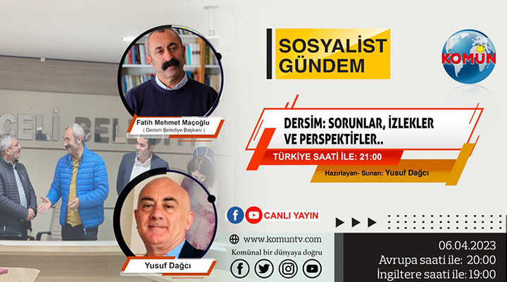Sosyalist Gündem’de bu akşam “Dersim: Sorunlar, İzlekler ve Perspektifler” konusu ele alınacak. Programı bu akşam Türkiye saatiyle 21.00’de Komün TV ekranlarından...