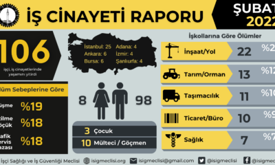 İşçi Sağlığı ve İş Güvenliği Meclisi (İSİG), Şubat 2022 iş cinayetleri raporunu yayınladı. Rapora göre şubat ayında 106 işçi yaşamını yitirdi.