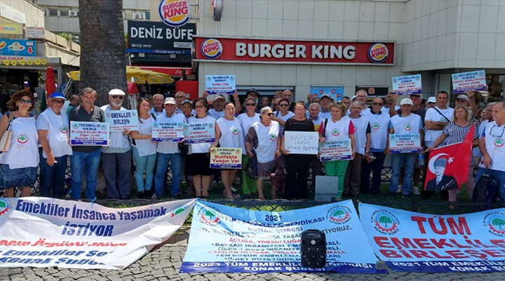 İzmir'de Konak Meydanı'nda saat 12.30'da toplanan Tüm Emekliler Sendikası üyeleri AKP iktidarına seslenerek "Zammını al başına çal" dedi.