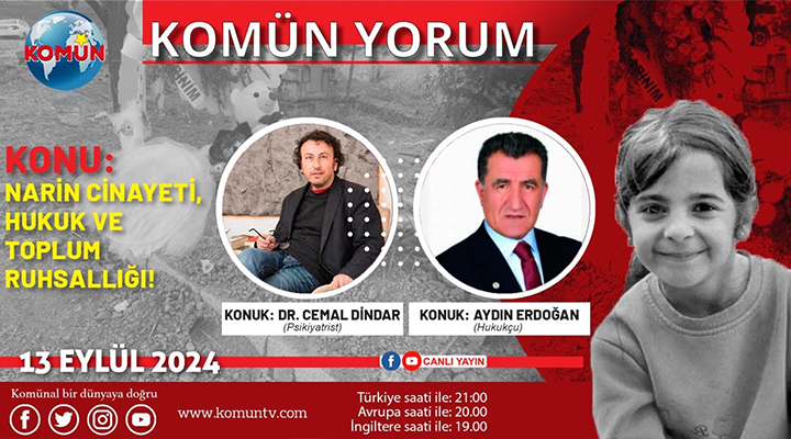 “Narin Cinayeti, Hukuk ve Toplum Ruhsallığı” konusunun ele alınacağı Komün Yorum programı bu akşam Türkiye saatiyle 21.00’de Komün TV’de.