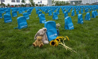 / 6 yıl agoUNICEF savaşlarda hayatını kaybeden çocuklar için 3758 okul çantasıyla sembolik mezarlık oluşturdu