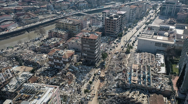 Maraş merkezli deprem felaketinin 8’inci gününde arama kurtarma çalışmalarının sürdüğü Antakya’da ortaya çıkan yıkım dron ile havadan görüntülendi.