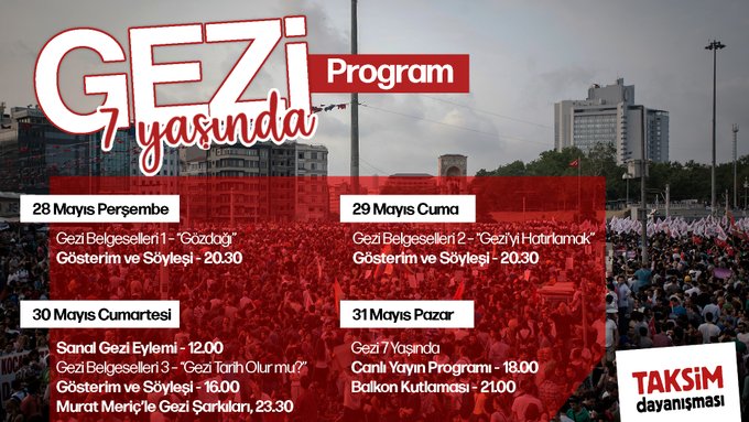 31 Mayıs’ta saat 18.00’de başlayacak olan “Gezi 7 Yaşında” canlı yayını ile direnişimizin 7’nci yaşını sosyal medya platformları üzerinden hep beraber kutlayacağız.