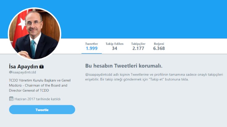 Ankara’da yüksek hızlı trenin kılavuz trenle çarpışması sonrası Türkiye Cumhuriyeti Devlet Demiryolları (TCDD) Genel Müdürü İsa Apaydın, Twitter hesabını kilitledi. Kaza sonrası devletin ilgili kurumlarından açıklamalar gelirken TCDD Genel Müdürü Apaydın henüz bir açıklama yapmadı. Apaydın, daha önce de Çorlu’daki tren kazasında oğlunu ve eski eşini kaybeden Mısra Öz Sel’i sosyal medyada engellemişti