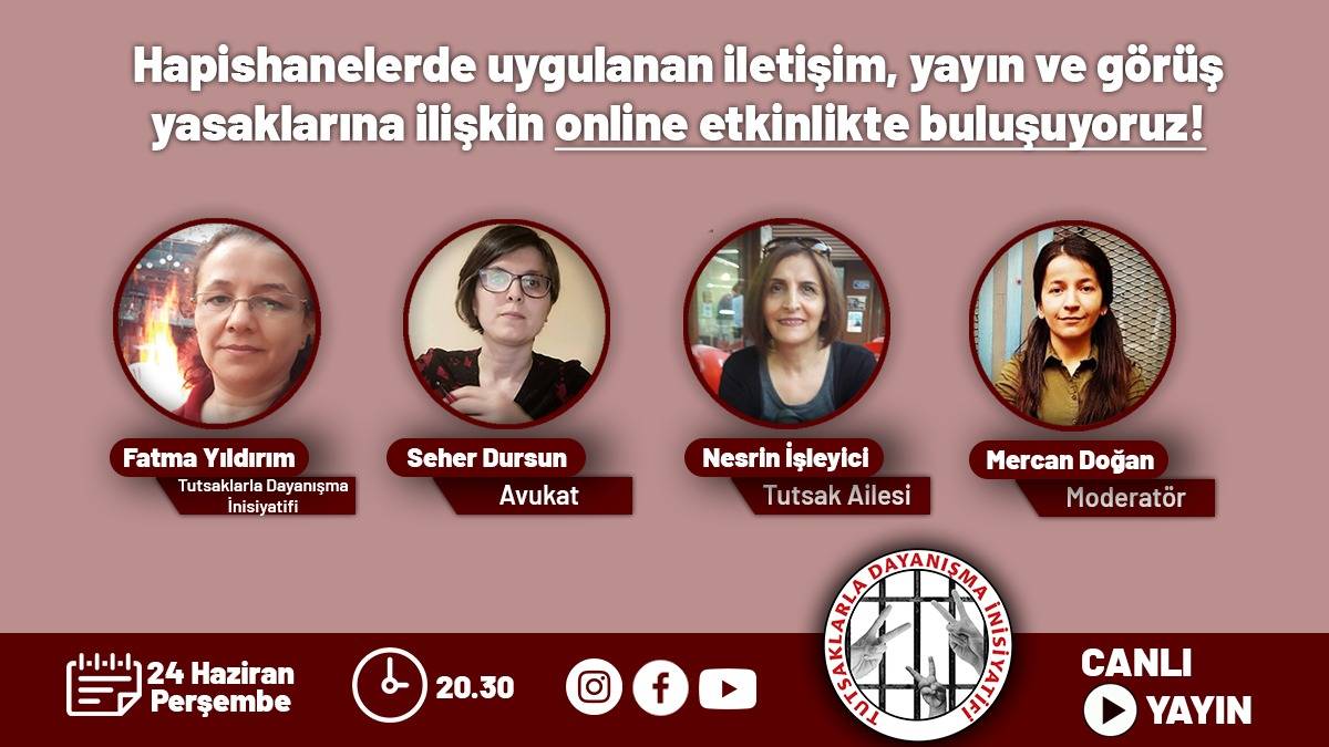 Tutsaklarla Dayanışma inisiyatifi pandemi süreciyle birlikte, yoğunlaşan hak gasplarını (iletişim, yayın ve görüş yasakları) ve keyfi uygulamalarla ilgili 24 Haziran (bugün) saat: 20.30 da online program yapacaklarını duyurdu