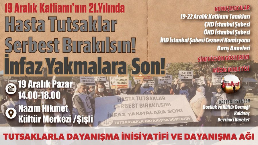 Tutsaklarla Dayanışma İnisiyatifi’nin (TDİ) 19-22 Aralık Katliamı’nın 21. yılında “Hasta Tutsaklar Serbest Bırakılsın! İnfaz Yakmalara Son!” şiarıyla düzenleyeceği etkinliğe konuşmacı olarak 19-22 Aralık Katliamı tanıkları, ÇHD İstanbul Şubesi, ÖHD İstanbul Şubesi, İHD İstanbul Şubesi Cezaevi Komisyonu ve Barış Anneleri katılım gösterecek.