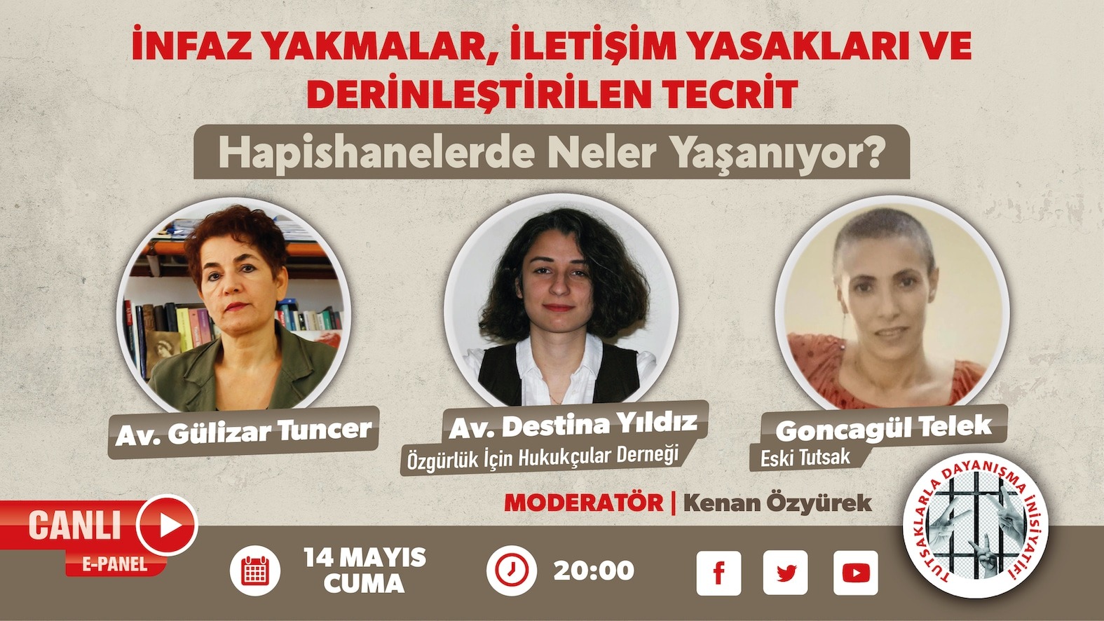 14 Mayıs 2021 Cuma günü 20.00’da gerçekleşecek olan panel, Tutsaklarla Dayanışma İnisiyatifi’nin Twitter, Facebook ve Youtube hesaplarından canlı olarak izleyebilirsiniz.