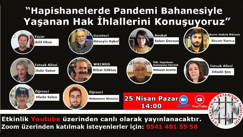 Zoom ve Youtube üzerinden canlı yayın olarak yayınlanacak etkinliğe, tutsak aileleri, ev hapsi alan öğrenciler, tutsakların yaşadıkları hak ihlallerini sürekli gündeme getiren gazeteci Hüseyin Aykol, yazar Adil Okay ile Asrın Hukuk Bürosu avukatı Rezan Sarıca ve TDİ avukatı Seher Dursun katılacak.