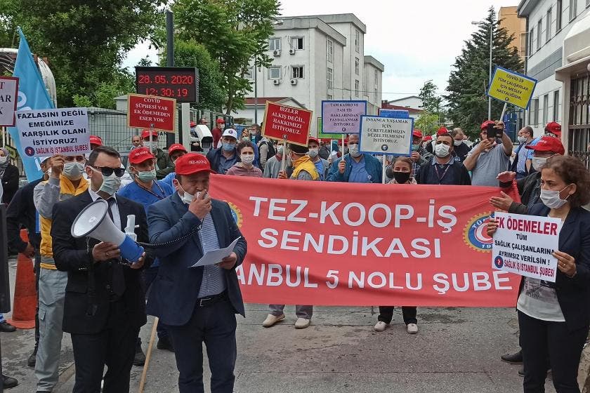 Tez Koop-İş Sendikası, sağlık çalışanlarına dönük eşitsiz ek ödemelere karşı basın açıklaması yaptı. Basın açıklamasında Kovid-19 hastalığının tüm çalışanlar için meslek hastalığı olarak tanınması gerektiği vurgulandı.