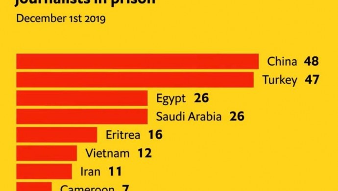 Britanya’dan yayın yapan dünyaca ünlü ekonomi dergisi The Economist, 1 Aralık 2019 itibariyle hapishanelerde en çok gazeteci bulunan ilk on ülkeyi sıraladı. Türkiye listede Çin’in arkasından hapishanelerde en çok gazeteci bulunduran ikinci ülke oldu.