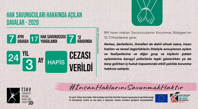 TİHV Dokümantasyon Merkezi’nin verilerinden derlenen infografiğe göre 2020 yılında; 7 ayrı davada 17 hak savunucusu yargılandı. 7’si hakkında 24 yıl 3 ay hapis cezası verildi. İnsan hakları örgütlerine üye ve yöneticisi 324 kişi gözaltına alınırken, 90’ı tutuklandı. Kadın ve LGBTİ+ haklarıyla ilgili 10 etkinlik engellendi, 4 etkinlik yasaklandı. 18 toplantı ve gösteriye kolluk güçleri tarafından müdahale edilirken, 164 kişi işkence ve kötü muameleye uğradı, gözaltına alındı. Çok sayıda kişiye idari para cezası kesildi. Çevre ve kent hakkıyla ilgili 18 eyleme polis saldırdı. 84 kişi gözaltına alınırken işkence ve kötü muamele gördü.