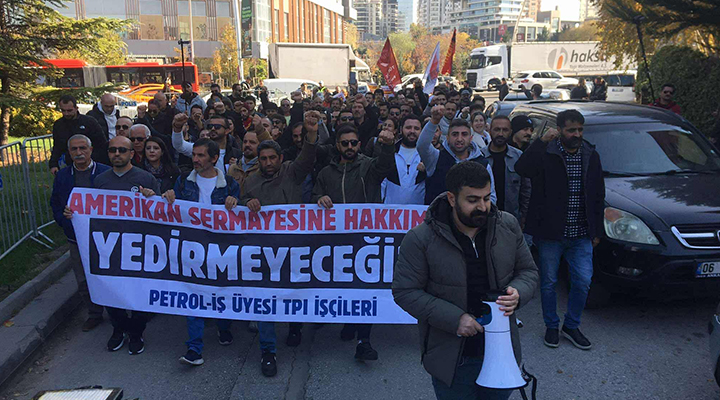 Petrol-İş üyesi TPI işçileri, hak gasplarına ve işten atmalara karşı yürüttükleri direnişi Ankara’ya taşıdı. Söğütözü Metro Durağı’nda toplanan işçiler, ABD Konsolosluğu önüne yürüyüş gerçekleştirdi. Burada yapılan basın açıklamsında işçiler, “Biz buraya dilenmeye değil, hakkımız olanı talep etmeye geldik. Bu mücadele sadece hak mücadelesi değil, işçi sınıfının onur mücadelesidir” dedi.