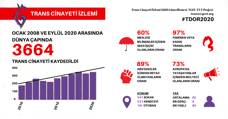 Transgender Europe’un yayımladığı rapora göre Ocak 2008 ve Eylül 2020 arasında dünya çapında 3664 trans cinayeti kaydedildi. Sadece son yılda kaydedilen cinayetlerin sayısı ise 350. Trans Respect araştırması, trans cinayetlerinde son 10 yılda kademeli bir artış görüldüğünü belirtiyor.