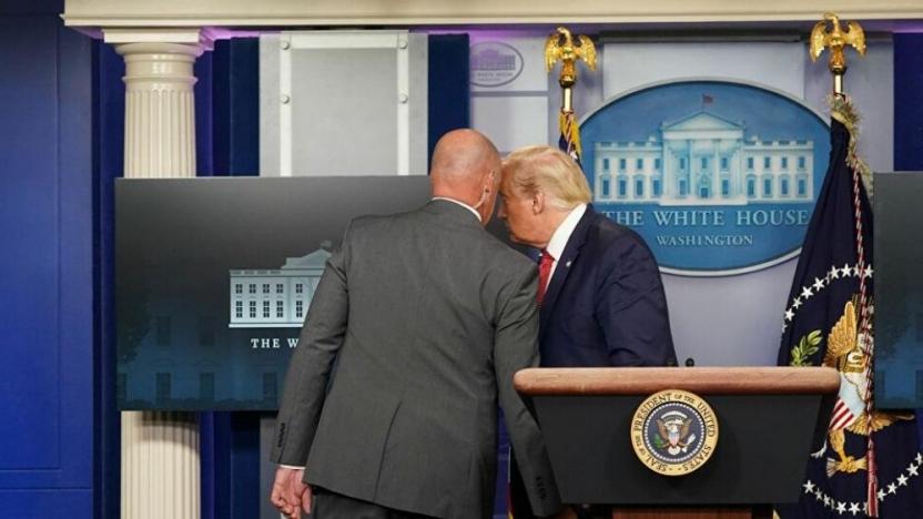 ABD Başkanı Donald Trump, Beyaz Saray’da günlük basın toplantısı düzenlediği sırada, programı bölen Gizli Servis tarafından salondan çıkarıldı. Salondaki muhabirlerin dışarı çıkmasına izin verilmezken, Trump bir süre sonra salona döndü.