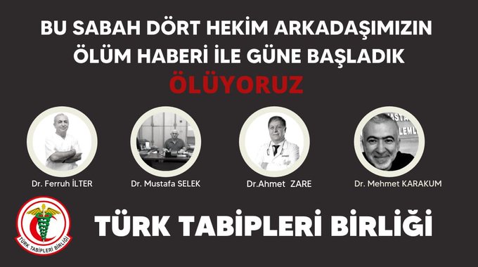 TTB, 4 doktorun daha Covid-19’dan hayatını kaybettiğini açıkladı. Sosyal medya hesapları üzerinden açıklama yapan Türk Tabipler Birliği (TTB), ‘Bu sabah dört hekim arkadaşımızın ölüm haberi ile güne başladık’ paylaşımı yaptı.