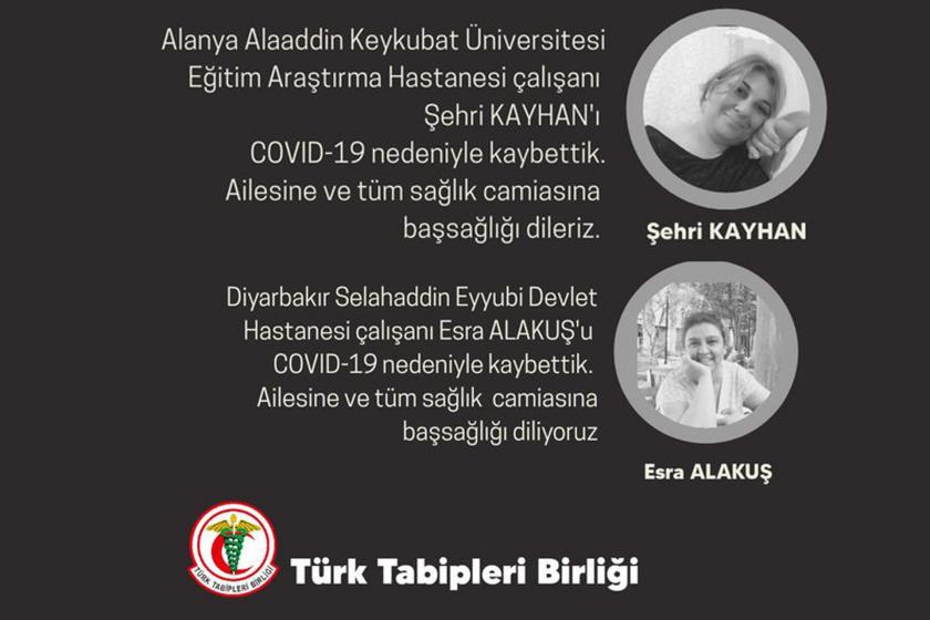 Türk Tabipler Birliği(TTB), sosyal medya hesaplarından yaptığı açıklama ile iki sağlık emekçisinin daha Kovid-9 sebebiyle yaşamını yitirdiğini belirtti