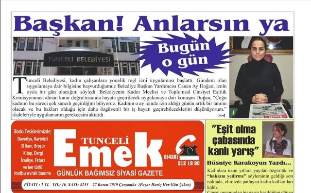 Demokratik Kadın Hareketi (DKH) Tunceli Emek gazetesinin ve gazete genel yayın yönetmeni Hüsniye Karakoyun’un Dersim Belediyesi Kadın Meclisi’nin ve Eşitlik Komisyonu’nun belediye çalışanları için ayda bir gün menstrüasyon(regl) izni haberine ilişkin açıklama yaptı.