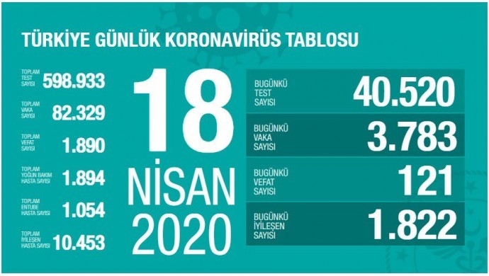 Türkiye’nin güncel koronavirüs tablosunu paylaşan Sağlık Bakanı Koca, son 24 saat içerisinde vaka sayısının 3 bin 728 olduğunu ve 121 kişinin de hayatını kaybettiğini açıklayarak, toplam hayatını kaybedenlerin sayısının 1890’a yükseldiğini duyurdu.